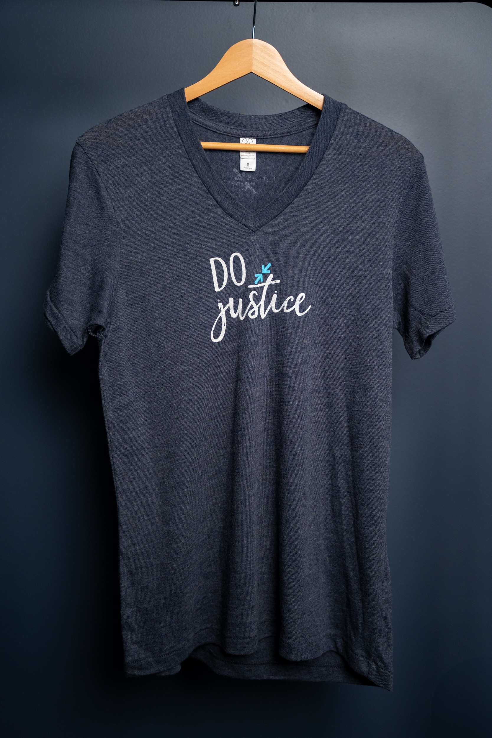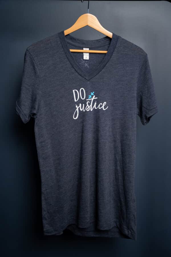 Support the work of Justice and Mercy International with the Do Justice V-Neck. This soft and comfy tee is a heather navy blue with a white and blue design. The JMI logo is displayed on the back collar.